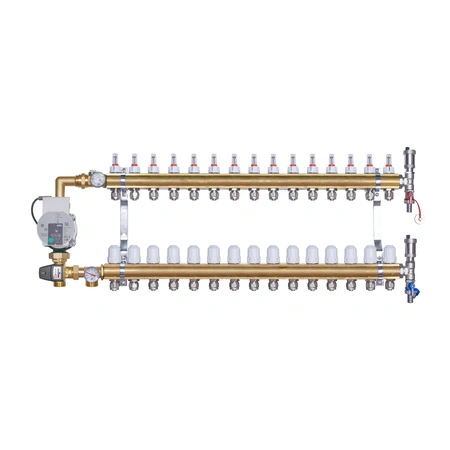 - Rozdzielacz mosiężny uzbrojony w przepływomierze, zawory termostatyczne, komplety odpowietrzająco spustowe i grupę pompowo – mieszającą do instalacji ogrzewania podłogowego z 15 obwodami i złączkami instalacyjnymi do rur PEX / PERT 16mm