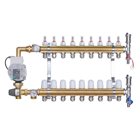 Rozdzielacz mosiężny do ogrzewania podłogowego 9 obwodów z adapterami PEX16 i grupą mieszającą 3,4KVS z pompą Wilo